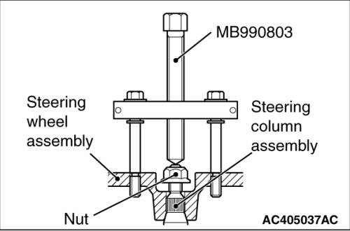 Use the special tool to remove the steering wheel since the steering column collision absorbing mechanism may be damaged.