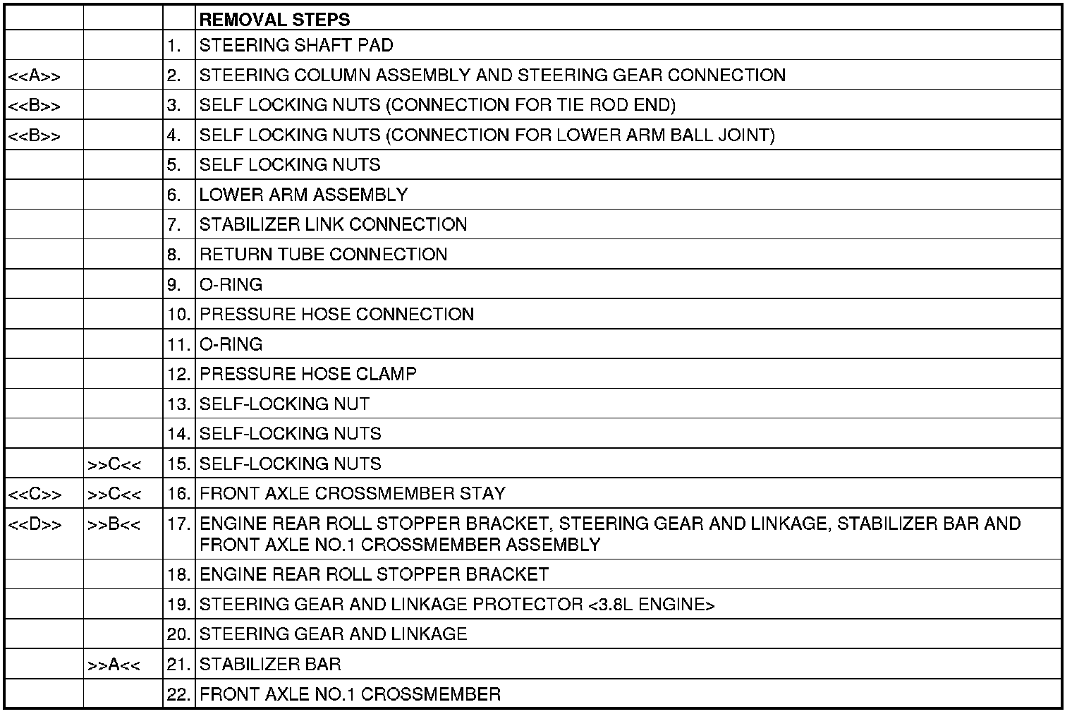 [[D]] ENGINE REAR ROLL STOPPER BRACKET, STEERING GEAR AND LINKAGE, STABILIZER BAR AND FRONT AXLE NO.1 CROSSMEMBER ASSEMBLY REMOVAL