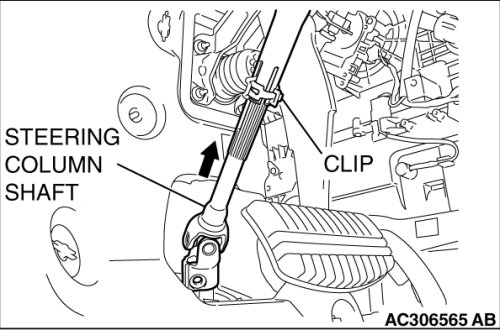 Pinch the steering column shaft clip with pliers, and pull up the shaft in the direction shown to disengage the steering column assembly.