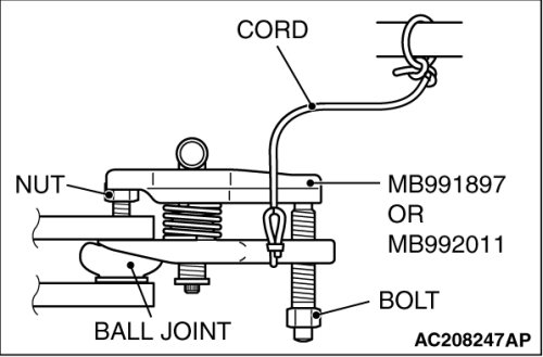 Replace the self locking nut for lower arm ball joint with a regular nut, because the original one too bit large to install special tool MB991897 or MB992011. Install the special tool as shown in the figure.
