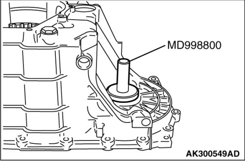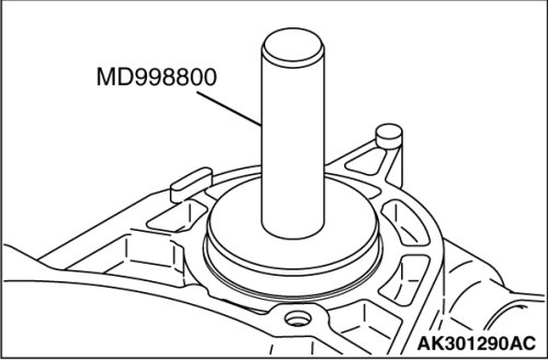 Use special tool MD998800 to tap the oil seal in the transaxle case.