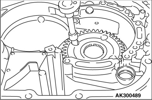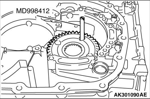 1. Install special tool MD998412 in the installation screw hole of the transfer drive gear bearing located in the transaxle case. Using this as a guide, install the transfer drive gear bearing and gear in the transaxle case.
