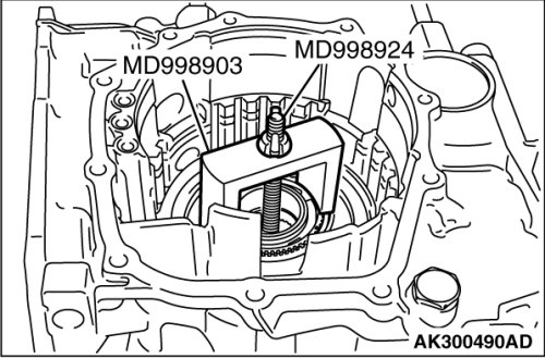 7. Set special tools MD998903 and MD998924 as shown, and then compress the one-way clutch inner race and install the snap ring.
