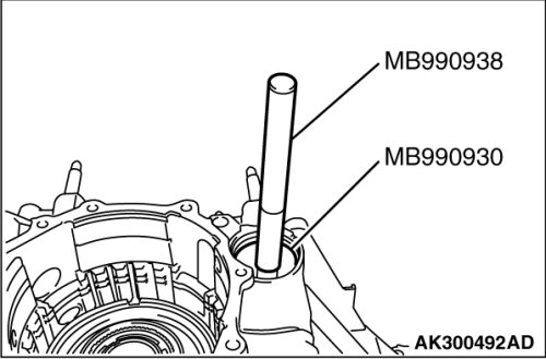 22. Use special tools MB990930 and MB990938 to tap the output shaft bearing outer race in the transaxle case.