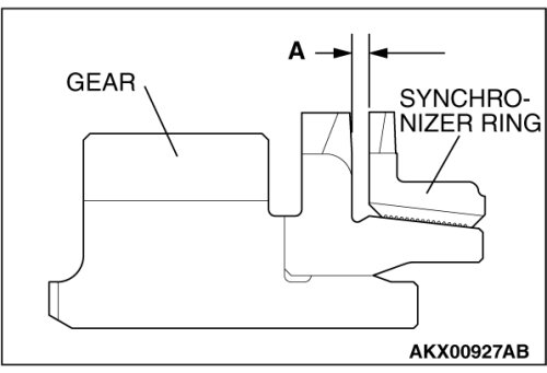3. Force the synchronizer ring toward the clutch gear and check clearance "A." If "A" is less than the limit, replace the synchronizer ring.