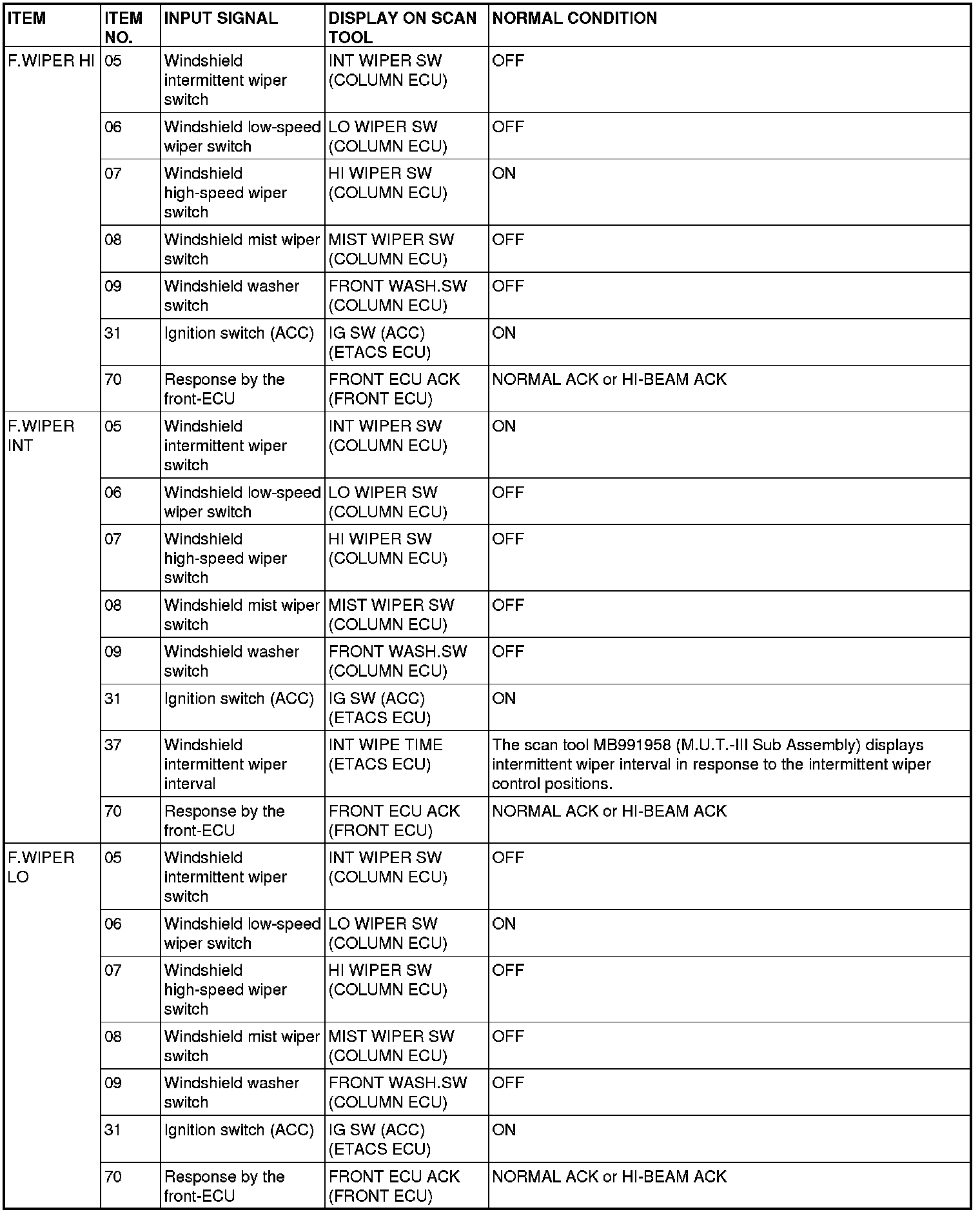 2. The following input signals can be checked by using the scan tool MB991958 (M.U.T.-III Sub Assembly) and the SWS monitor kit.