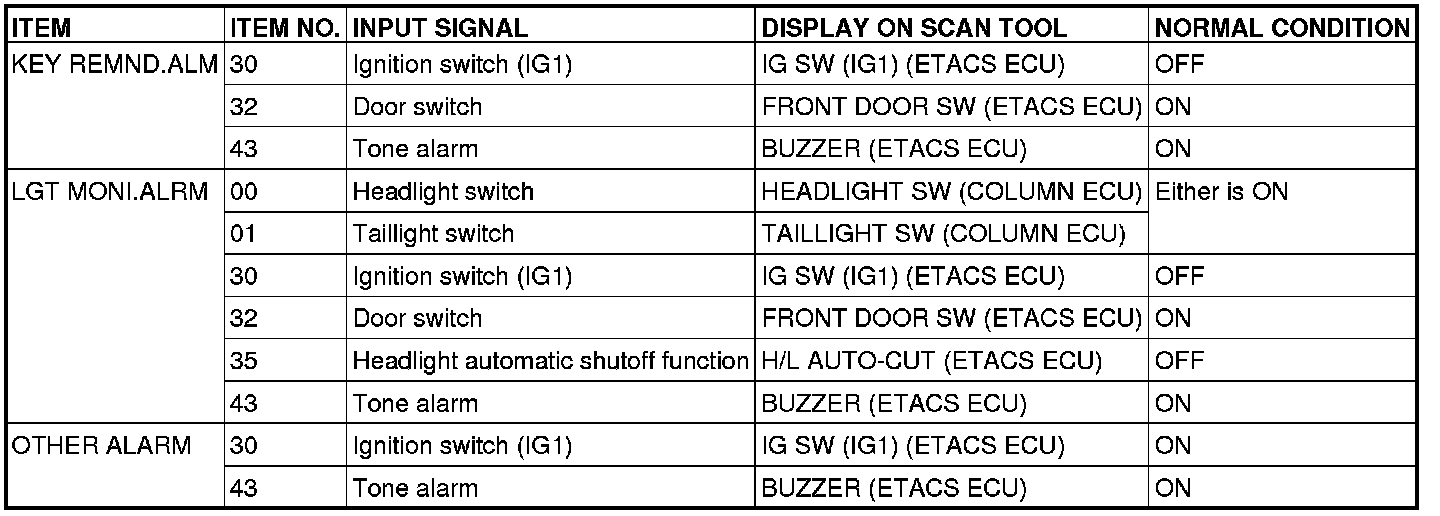 For item No.43, the scan tool MB991958 (M.U.T.-III Sub Assembly) also displays "ON" when the light reminder tone alarm or the seat belt tone alarm function is triggered.