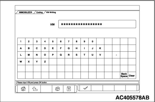 The Vehicle Identification Number (VIN) is stored in the ECM or PCM by the vehicle manufacture. If the VIN to be stored in the ECM or PCM is eliminated fraudulently, the Malfunction Indicator Lamp (SERVICE ENGINE SOON or Check Engine Lamp) illuminates and Diagnostic Trouble Code (DTC) No.P0630 (VIN malfunction) is shown. When the ECM or PCM is replaced, and entry of the VIN necessary due to DTC No. P0630 (VIN malfunction). Enter the VIN in accordance with the procedure as follows: