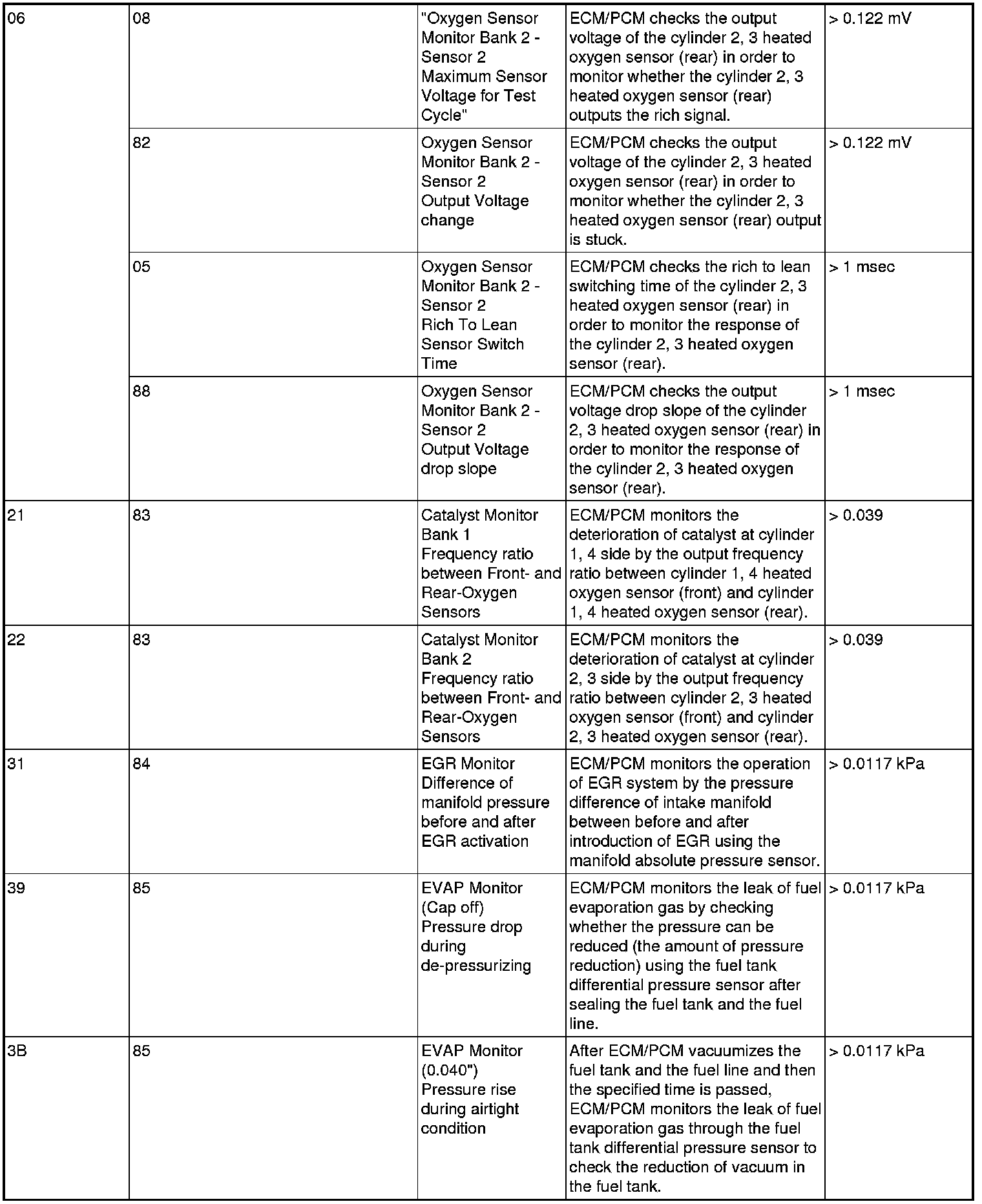 By selecting MODE 6 using scan tool, Test Result and Limit Value (minimum) *1 or (maximum) *2 about the main items of emission control system which ECM/PCM monitors can be confirmed. The value at the last monitoring is output by ECM/PCM as a test result.