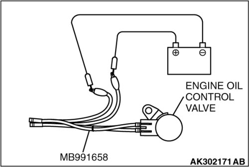 1. Disconnect the engine oil control valve connector and connect special tool MB991658 to the connector on the engine oil control valve side.