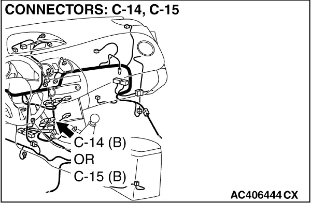 STEP 1. Check joint connector (3) C-03 and A/C-ECU connector C-14 [manual air conditioning system] or C-15 [automatic air conditioning system] for loose, corroded or damaged terminals, or terminals pushed back in the connector.
