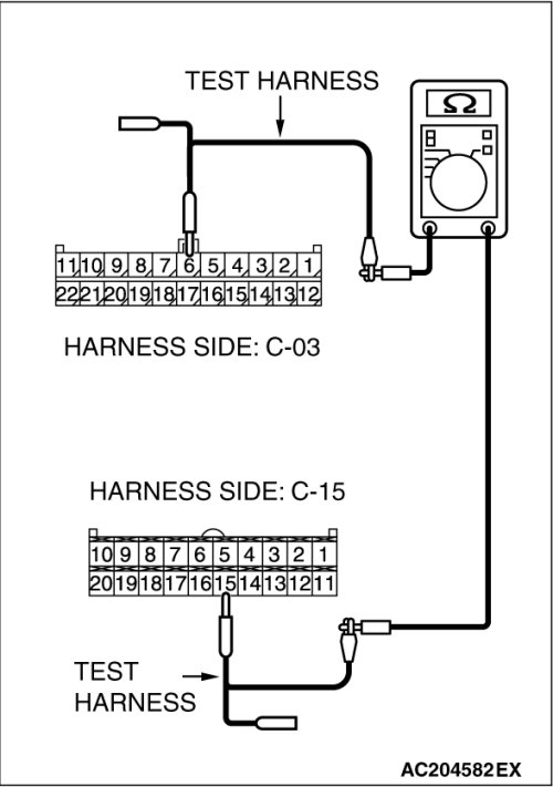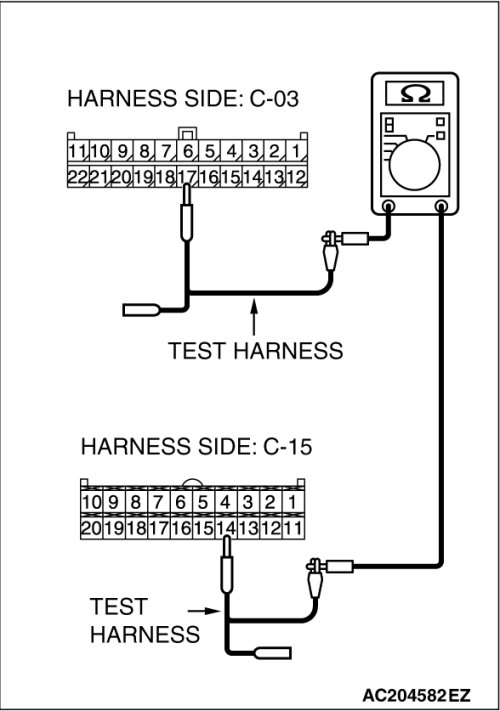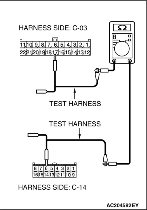STEP 2. Check the CAN bus lines between joint connector (3) C-03 and the A/C-ECU. Measure the resistance between joint connector (3) C-03 and A/C-ECU connector C-14 [manual air conditioning system] or C-15 [automatic air conditioning system].