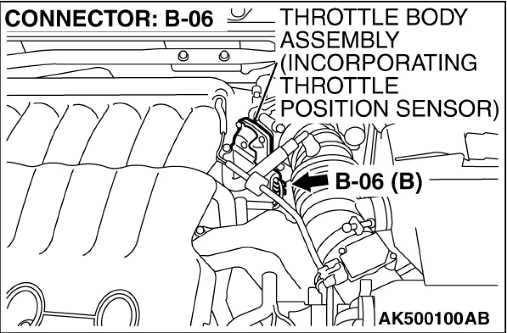STEP 2. Check harness connector B-06 at throttle position sensor for damage.
