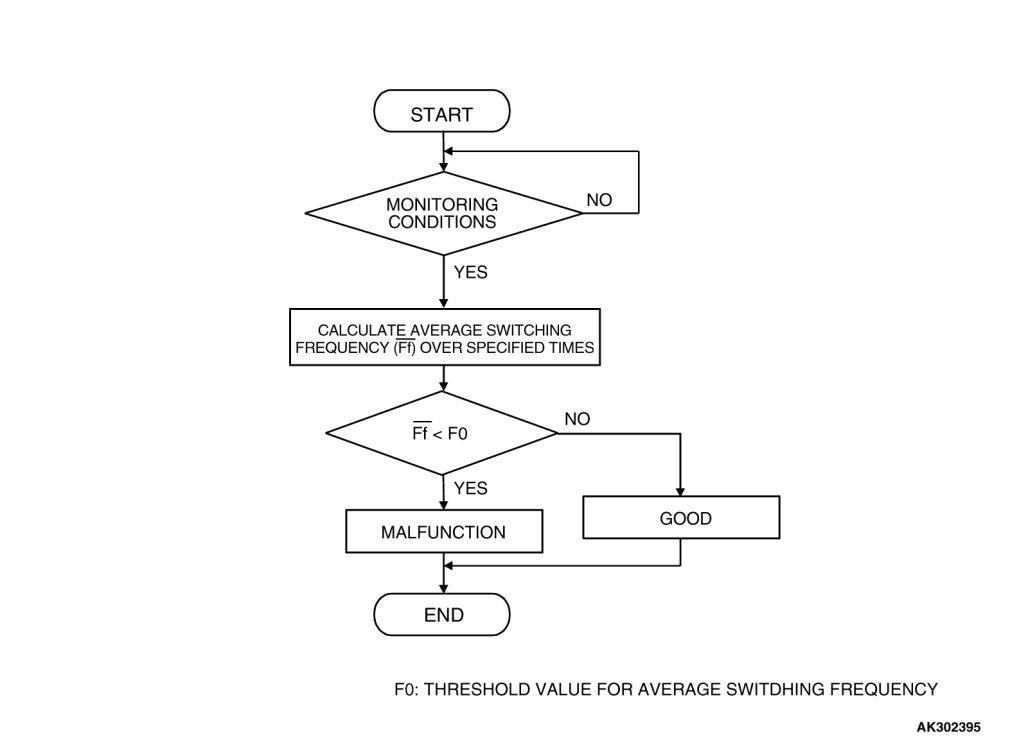 If the sensor switching frequency is lower than the Judgment Criteria due to the M.U.T.-III OBD-II test Mode - HO2S Test Results, it is assumed that the heated oxygen sensor has deteriorated.