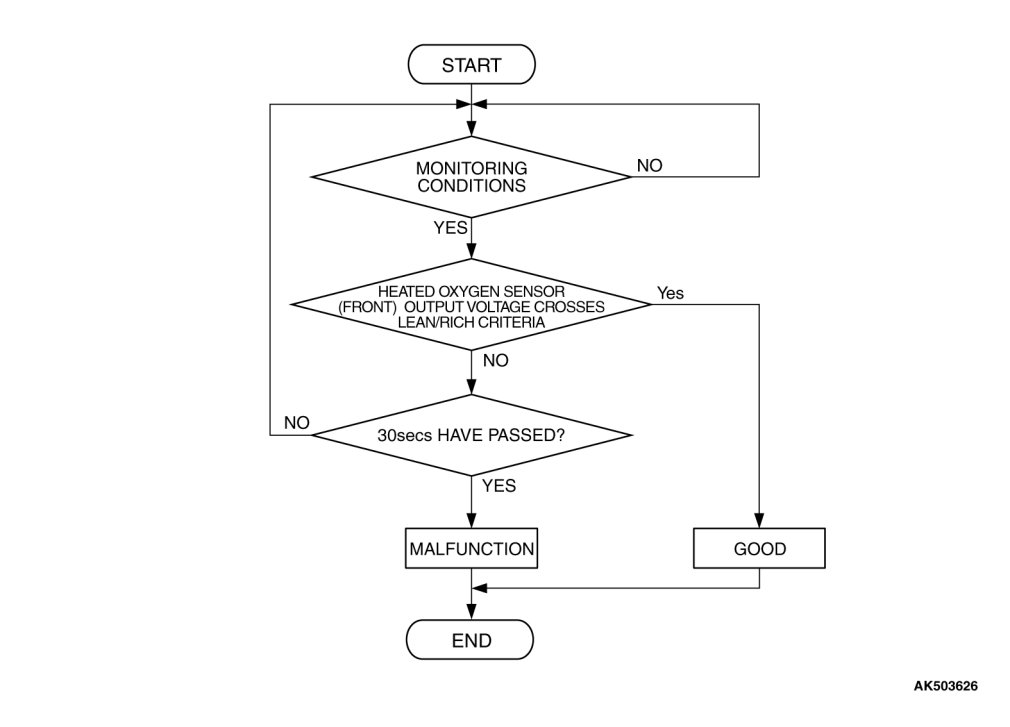 - Left bank heated oxygen sensor (front) output voltage does not get across lean/rich criteria (about 0.5 volt) within about 30 seconds.
