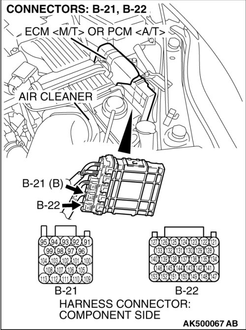 STEP 8. Check harness connector B-21, B-22 at ECM [M/T] or PCM [A/T]