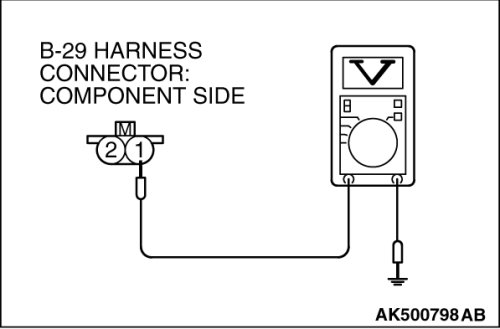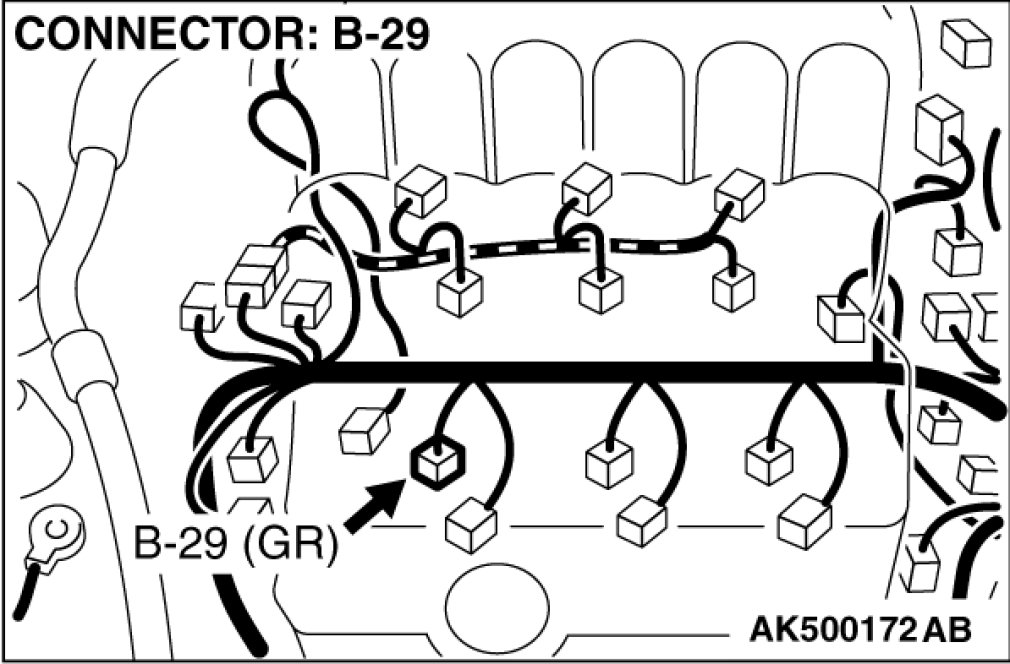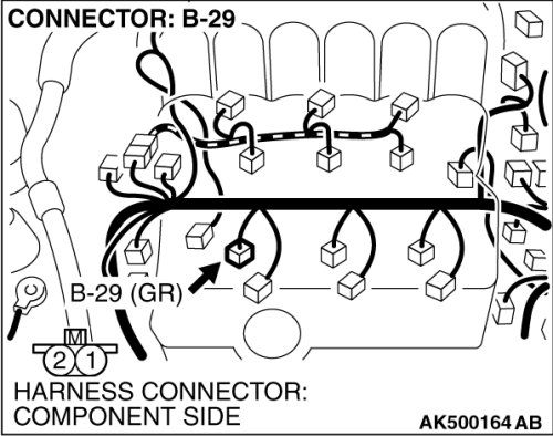 (1)Disconnect the No. 2 cylinder injector connector B-29 and connect the test harness special tool (MB991658) between the separated connectors. (All terminals should be connected)