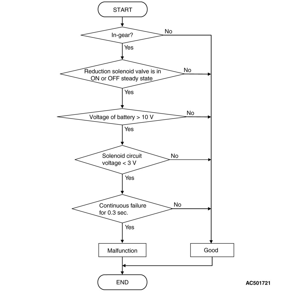 - If solenoid terminal voltage is below specified value when shift control is not in progress, PCM judges that reduction solenoid valve has a failure.