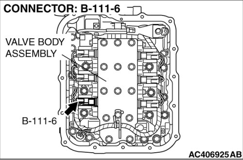 STEP 13. Check the harness for an open or short circuit to ground between A/T control solenoid valve assembly connector B-111 (terminals 7, 6, 8, and 10) and solenoid valve connectors B-111-4, B-111-5 and B-111-6.
