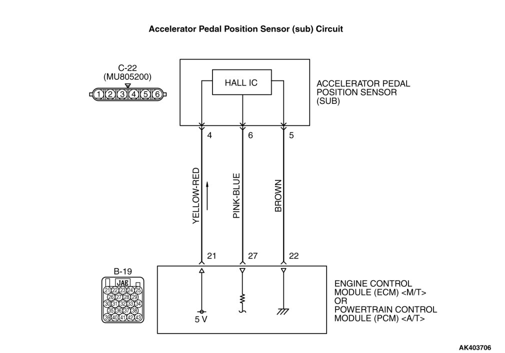 - A 5-volt power supply is applied on the accelerator pedal position sensor (sub) power terminal (terminal No. 4) from the ECM[ M/T] or the PCM[ A/T] (terminal No. 21).
