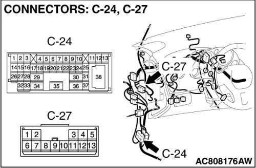 Also check intermediate connector C-27, D-29 and joint connector C-01 for loose, corroded, or damaged terminals, or terminals pushed back in the connector. If intermediate connector C-27, D-29 or joint connector C-01 is damaged, repair or replace the damaged component(s) as described in Harness Connector Inspection Harness Connector Inspection.