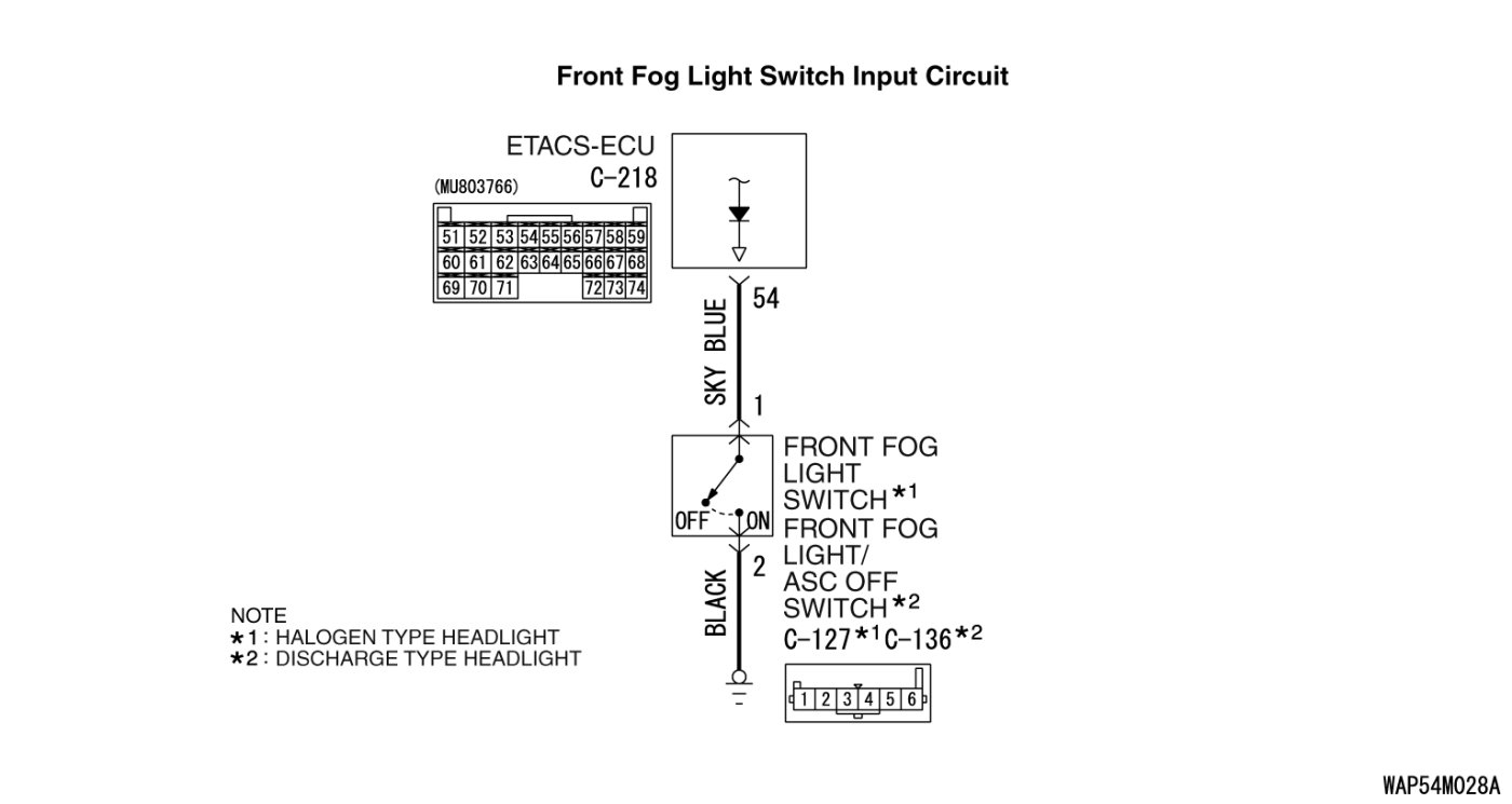 STEP 6. Check the wiring harness between front fog light switch connector C-127 [halogen type headlight] or front fog light ASC off switch connector C-136 [discharge type headlight] (terminal 1) and ETACS-ECU connector C-218 (terminal 54).