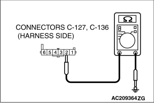 (1)Disconnect front fog light switch connector C-127 [halogen type headlight] or front fog light ASC off switch connector C-136 [discharge type headlight] and measure the resistance available at the wiring harness side of the connector.