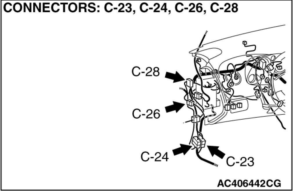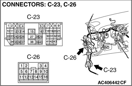 Also check intermediate connectors A-15, C-23 and C-26. If intermediate connectors A-15, C-23 or C-26 is damaged, repair or replace the connector as described in Harness Connector Inspection Harness Connector Inspection.