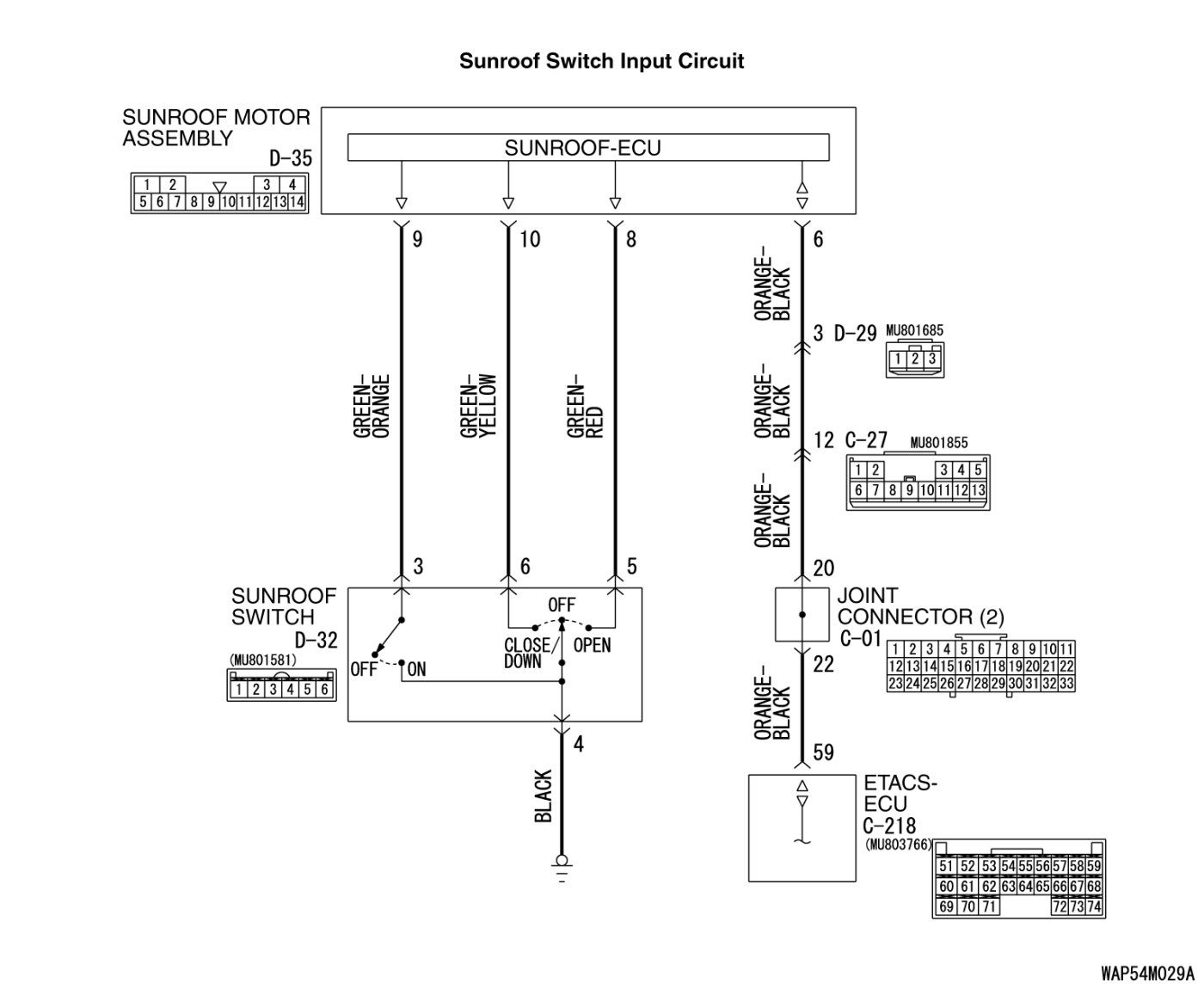 The ETACS-ECU receives a signal through the sunroof motor assembly via the SWS communication line from the sunroof switch, and sends a signal to the data link connector.