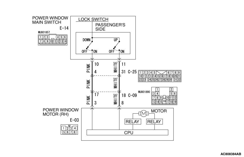 When you operate power window switch for passengers (incorporated in the power window main switch), the power window motor (RH) operates, opening or closing power window (RH).