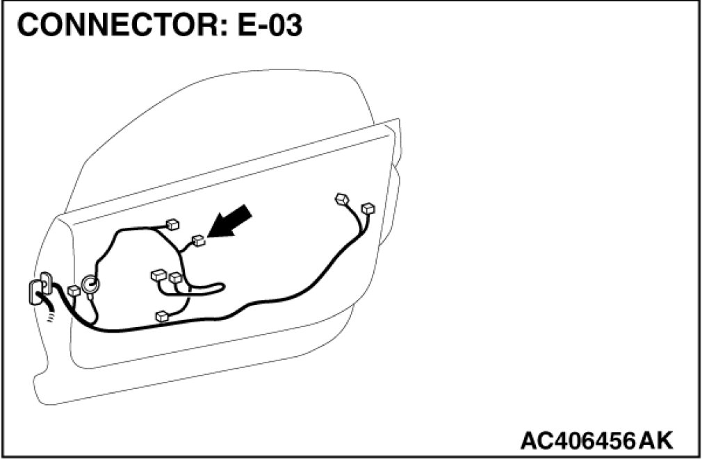 STEP 2. Check power window main switch connector E-14 and power window motor (RH) connector E-03 for loose, corroded or damaged terminals, or terminals pushed back in the connector.