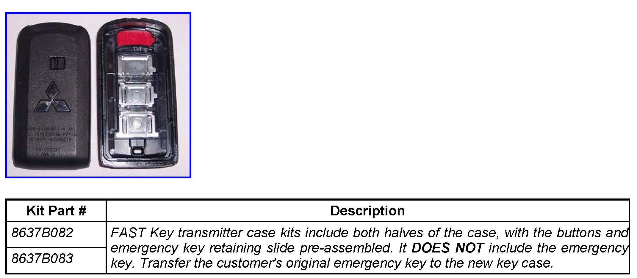 This TSB supercedes TSB-09-42A-015, issued October, 2009, to update affected vehicles, add Outlander Sport and add FAST Key case part numbers. Changes are indicated by <.
