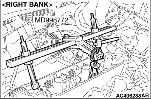 1. Install special tool MD998443 as shown in the illustration so that the lash adjusters will not fall out.