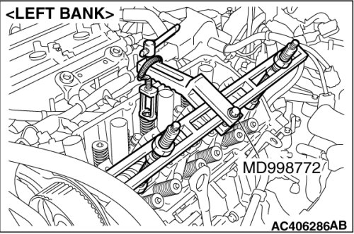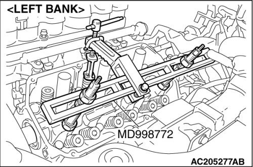 Use special tool MD998772 to compress the valve spring, and remove the valve spring retainer locks.