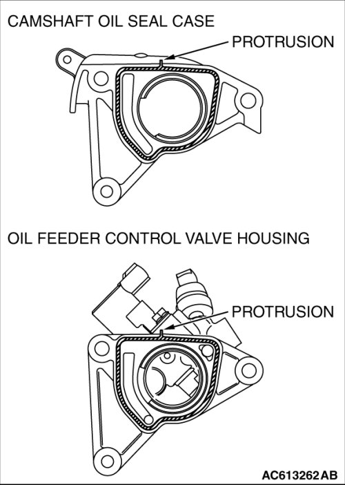1. Install the camshaft oil seal case gasket and oil feeder control valve housing gasket as their protrusions are in the direction shown.