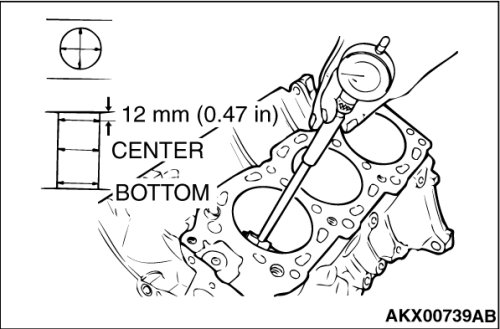 5. Using a cylinder gauge, measure the cylinder bore and cylindricality. If worn badly, correct by boring the cylinders to an oversize and replace pistons and piston rings. Measure at the points shown in the illustration.