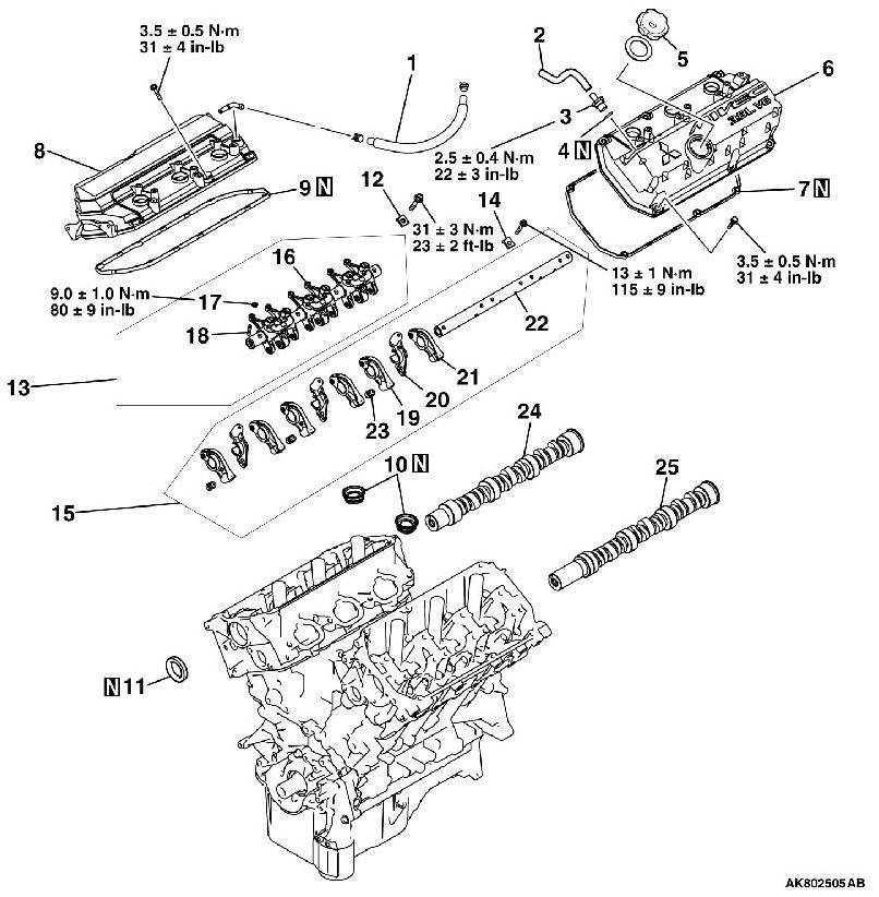6. Tighten the intake rocker arm shaft bolts to the specified torque of 13±1 Nm (115 ± 9 in-lb).