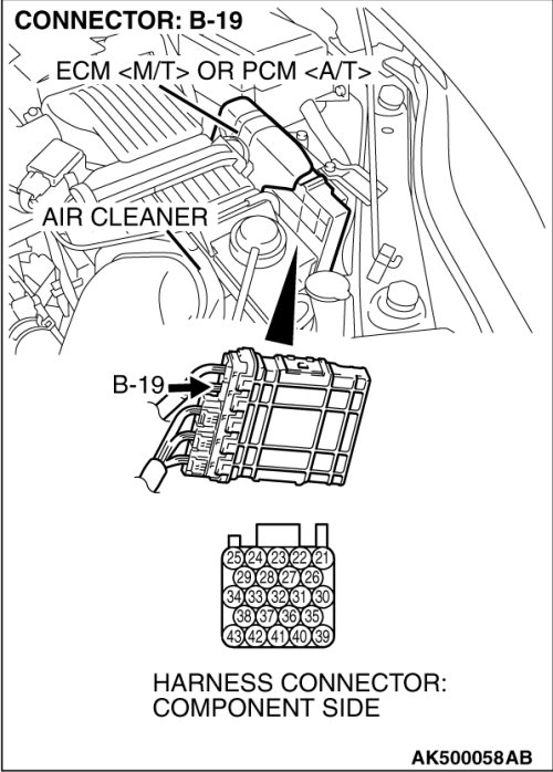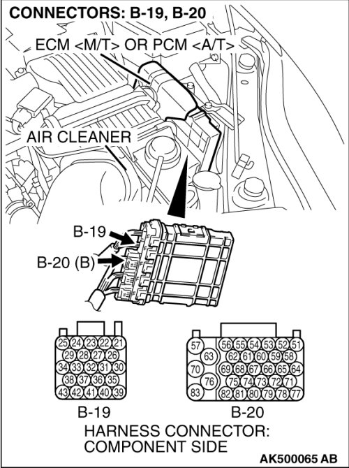 STEP 4. Check harness connector B-19 and B-20 at ECM [M/T] or PCM [A/T] for damage.