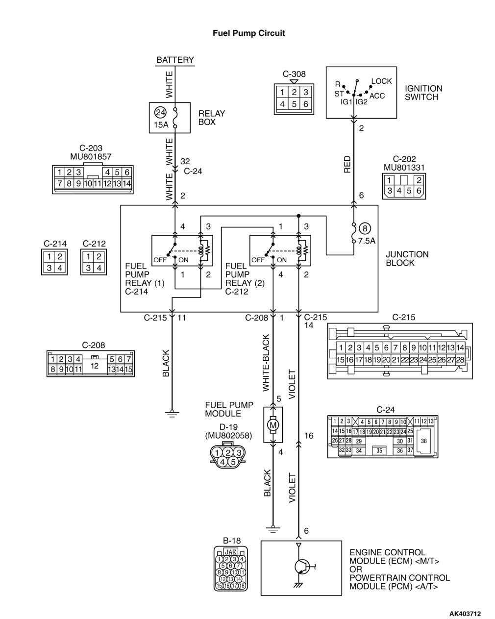 - During cranking and while the engine is running, the ECM[ M/T] or the PCM[ A/T] turns the power transistor in the ECM[ M/T] or the PCM[ A/T] ON to ground the fuel pump relay 2 coil. With this, the fuel pump relay turns ON, and the battery positive voltage is supplied to the fuel pump from the fuel pump relay 2 (terminal No. 4).