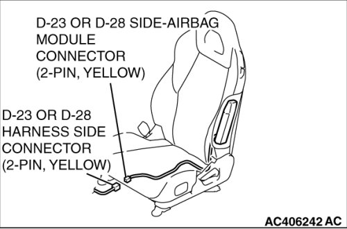 Remove the connection between the D-23 or D-28 side-airbag module connector (two-pin, yellow) and the harness side connector (two-pin, yellow).