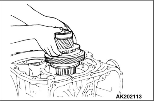 1. Install special tool MD998412 in the installation screw hole of the transfer drive gear bearing located in the transaxle case. Using this as a guide, install the transfer drive gear bearing and gear in the transaxle case.