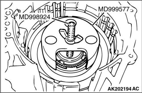 7. Set special tools MD999577 and MD998924 as shown, and then compress the one-way clutch inner race and install the snap ring.