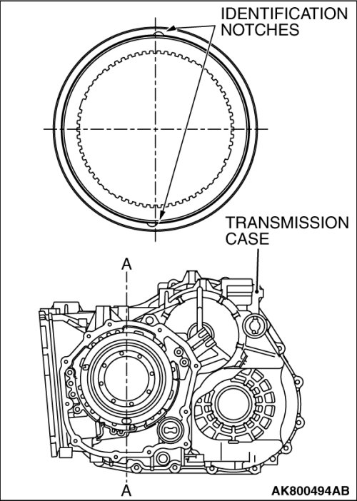 5. Check the placement of the identification notches in the one-way clutch inner race. Install the one-way clutch inner race to the transfer drive gear bearing so that the notches fall along the A - A line.
