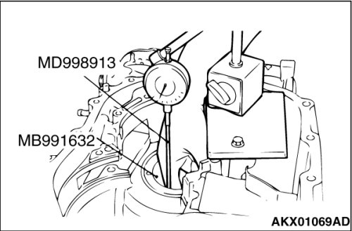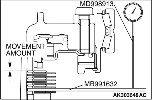 19. Install special tool MD998913 in a dial gauge, and then move special tool MB991632 and measure its movement.