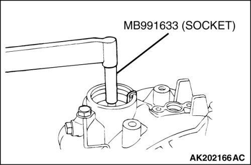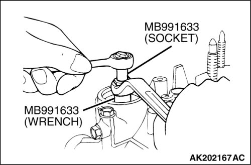 (3) Using a torque wrench fitted with the socket of the special tool MB991633, tighten the adjusting rod to 10 Nm (89 in-lb), then loosen it. Repeat this operation twice. Tighten the adjusting rod to 5 Nm (43in-lb), then turn it back 5-1/2 (180 degrees) to 5-3/4 (270 degrees) turns.
