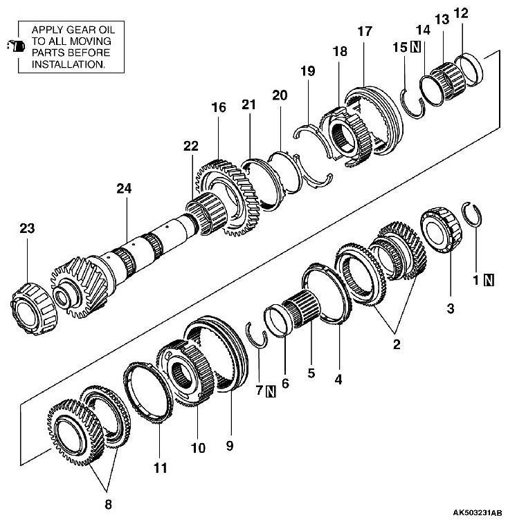 15. Set the synchronizer sleeve and synchronizer hub to the output shaft No.2 in the direction as shown in the illustration.