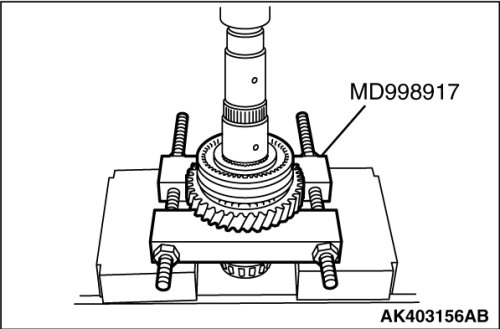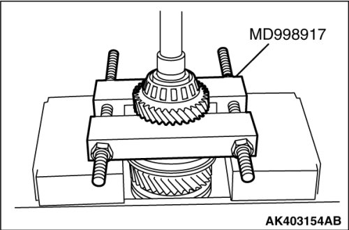 6. Using special tool MD998917, support the 5th gear sub-assembly and remove the synchronizer hub, synchronizer sleeve, synchronizer outer ring No.3 and 5th gear sub-assembly.