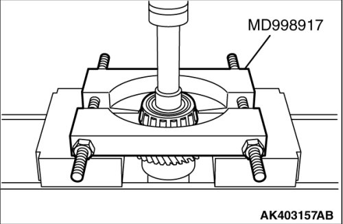 12. Using special tool MD998917, support the tapered roller bearing No.2 and remove the tapered roller bearing No.2.