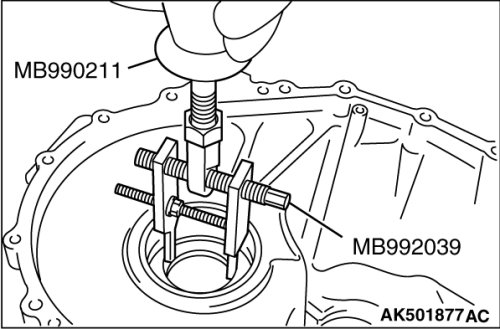 2. Using special tools MB990211 and MB992039, remove the tapered roller bearing No.1.
