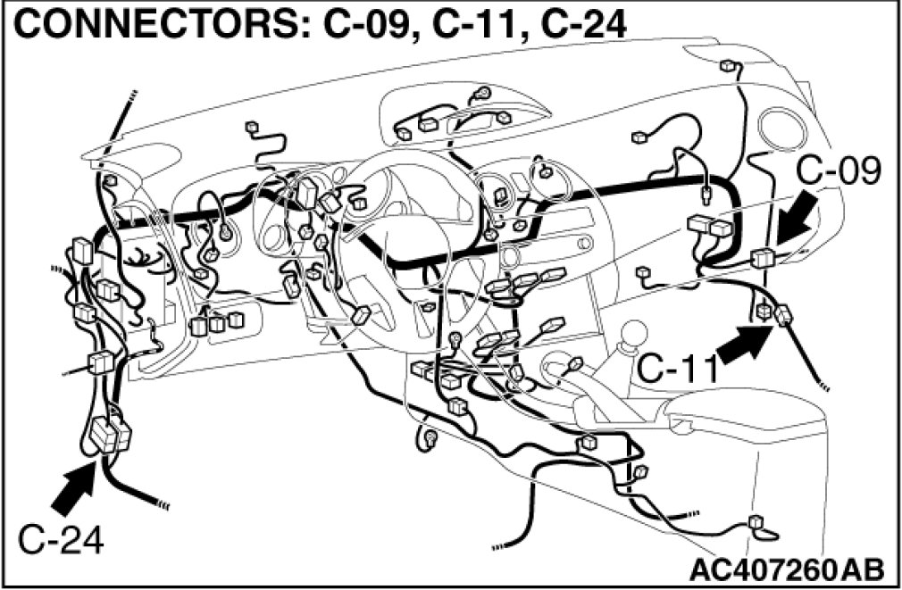 Also check intermediate connector C-09 and C-24 for loose, corroded or damaged terminals, or terminals pushed back in the connectors. If intermediate connector C-09 or C-24 is damaged, repair or replace the damaged component(s) as described in Harness Connector Inspection Harness Connector Inspection.